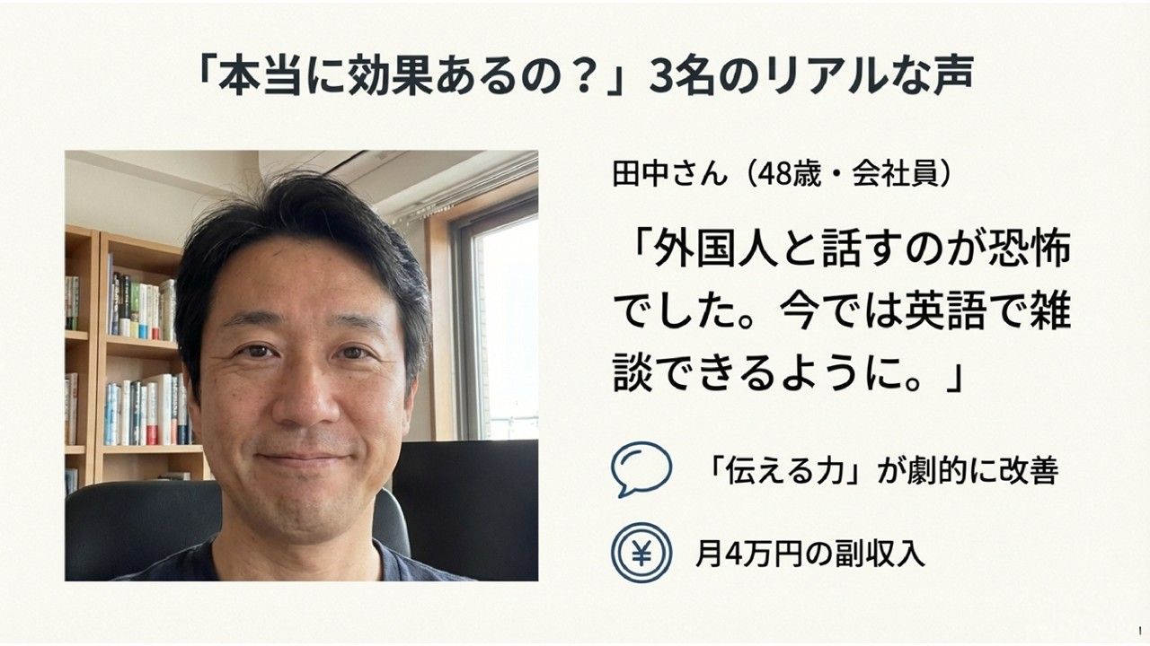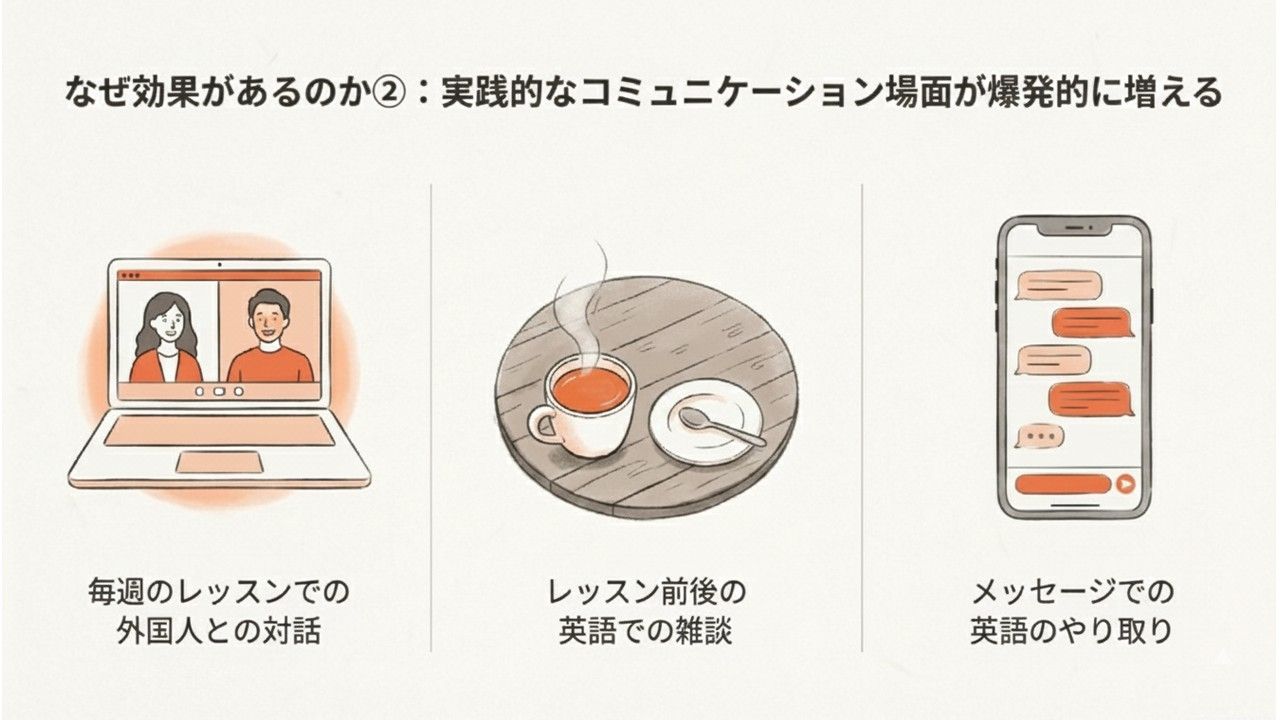 2つ目の理由は、実践的なコミュニケーション量が爆発的に増えることです。英語力を伸ばす決め手は、結局「生きた会話量」ですが、多くの人はここが圧倒的に不足しています。一方で日本語を学びたい外国人は世界中におり、国籍も多様です。実際に話してトライ&エラーを重ねた人から伸びるので、補助的に英語を使いながら日本語を教える経験は、一般的な英会話レッスン以上に濃い実戦になります。さらに、日本語を教えると立場が逆転し、練習にお金を払う側ではなく、報酬を得る側になれます。つまり「英語の実戦練習」と「副収入」を同時に得られるのです。