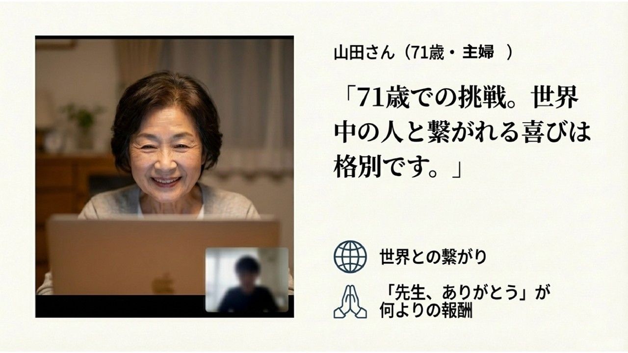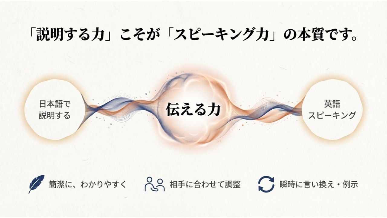 日本語を教えると、会話の土台となる「簡潔に説明する力」と「言い換え能力」が強制的に鍛えられます。英語が出てこない原因は英語力より、言いたいことが頭の中で長く複雑になっている場合が多いからです。英語化の前に日本語で短く整理し、伝わらなければ別の言い方へ即座に切り替える。相手が分からない反応を見たら、語彙と文をさらに易しくし、具体例で補い、理解の合図が出るまで粘る。この反復が毎回起こるため、語学の超コアスキルと会話の基礎体力が確実に伸びます。結果として、発信も会話も速く正確になる。日々積み上がる力。