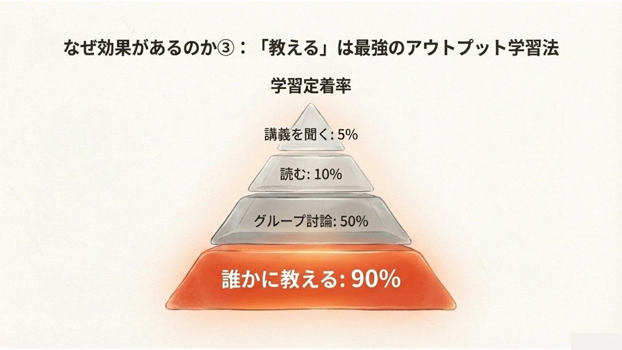 最後の理由は、「教えること」が最強のアウトプットになるからです。理解したつもりでも、教えようとすると曖昧な点や弱点が露呈します。問題集やオンライン英会話は基本的に「学ぶ側」ですが、教える側に回ると、相手が分かる形に整理し直し、表現を選び直す必要があります。研究でも、講義を聞く・討論するより、人に教える学習の定着率は最大90%まで高まるとされています。日本語レッスンで補助的に英語を使って説明を続ければ、理解が深まり、英語力は加速します。私自身も講師になってから弱点が明確になり、学び方が変わり、短期間で伸びました。